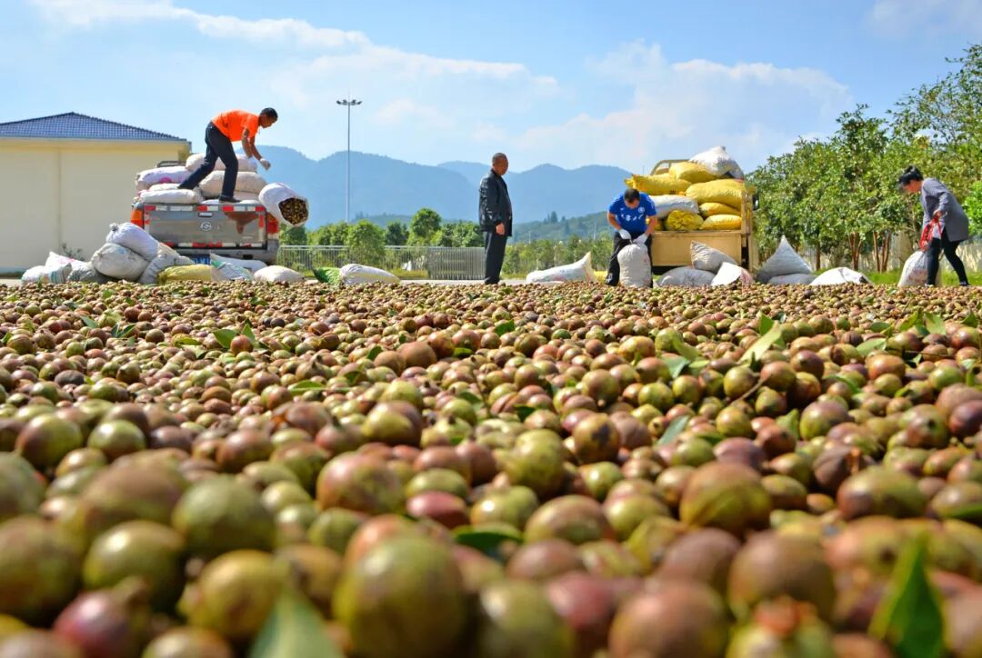 湖南永顺县石堤镇狮子村,村民将刚采摘的油茶鲜果送往加工。