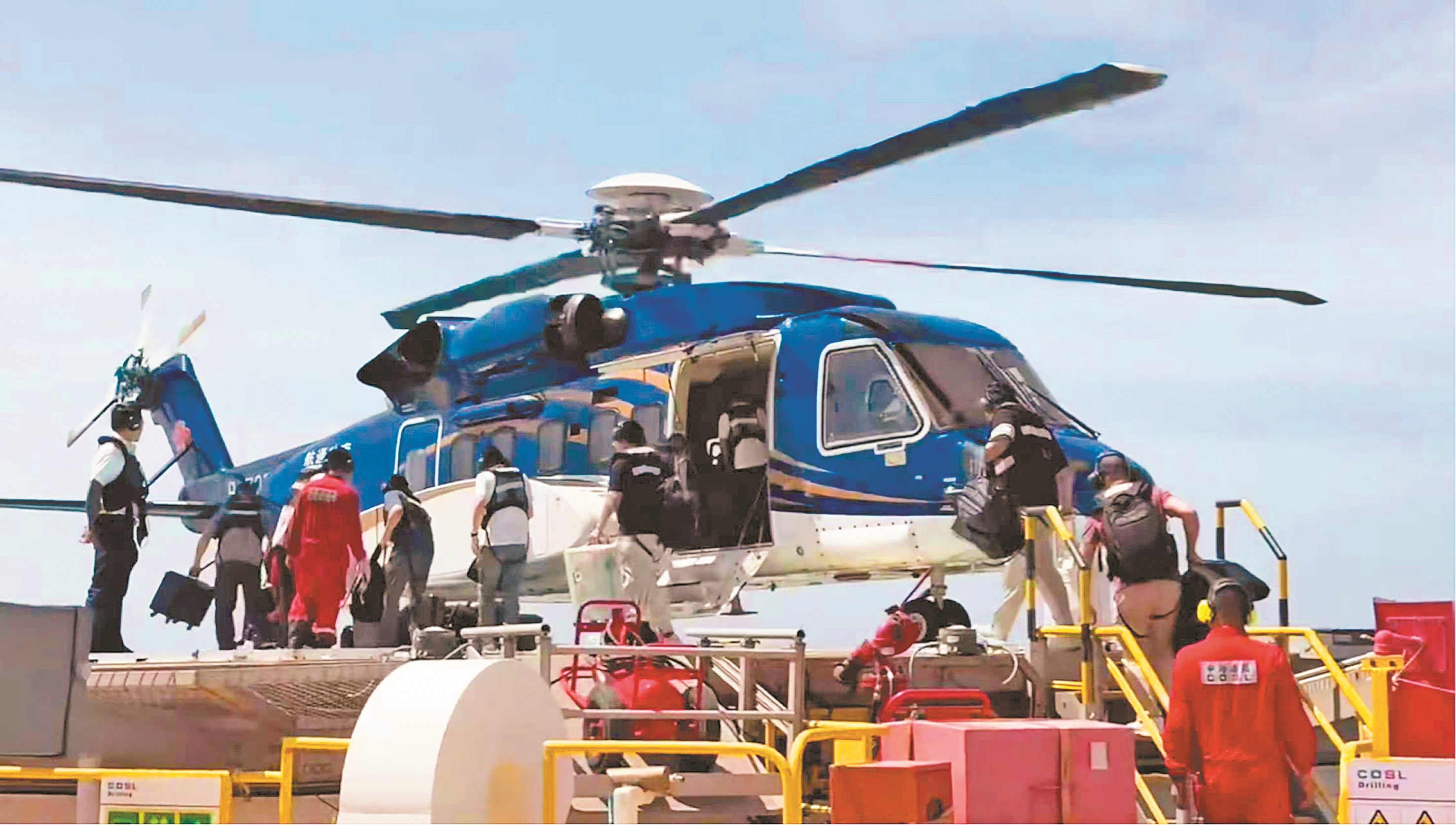9月24日,随着超强台风“桦加沙”进一步逼近广西,北部湾海域36座钻井平台的2278名工作人员已全部撤离。图为中海油涠洲钻井平台工作人员乘坐直升机返回陆地。蒋瑞卿 摄