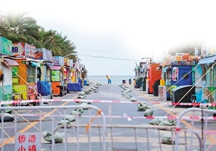 9月24日,北海侨港海滩关闭,入口处拉上警戒线,商户用缆绳和沙袋固定海滩旁的餐车。彭庆 摄