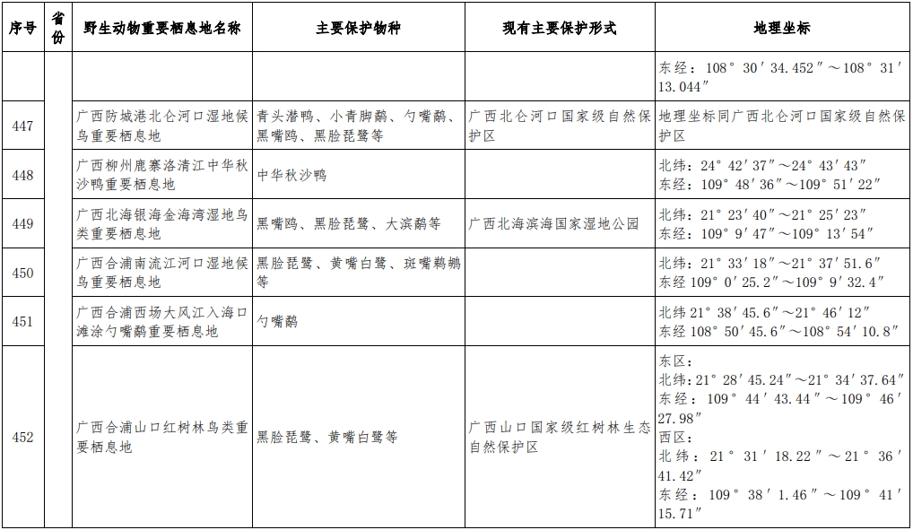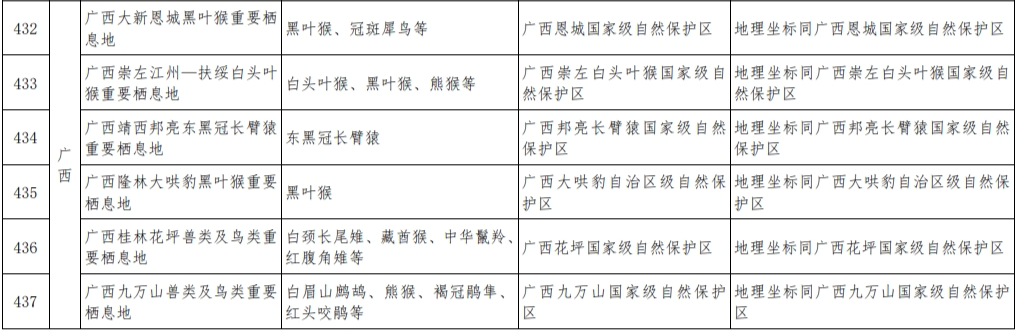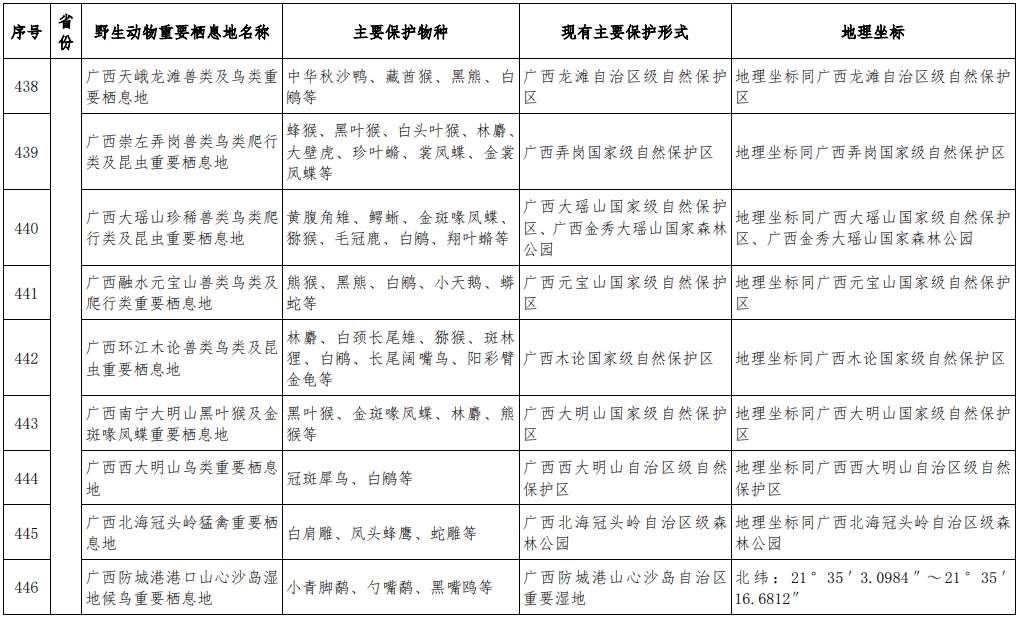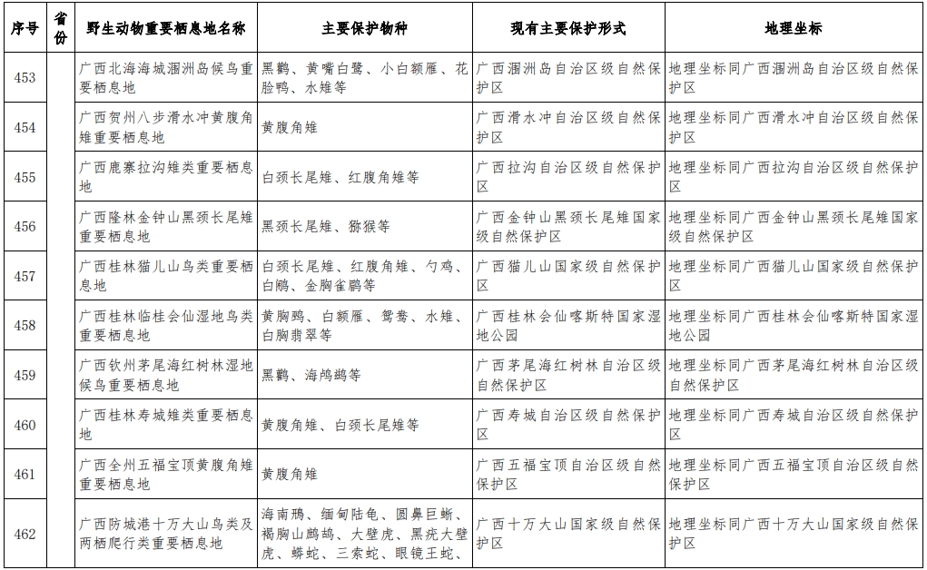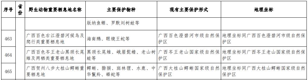 根据我国陆生野生动物物种的重要性、种群数量和栖息地区位重要性、特殊代表性等,首批陆生野生动物重要栖息地共分为珍贵濒危物种生存繁衍区域、野生动物集群分布区域等六类,涉及31个省、自治区、直辖市,覆盖了565种国家一、二级重点保护野生动物的栖息地、繁衍地、迁飞地,包括兽类127种、鸟类339种、两栖爬行类62种、昆虫37种。
