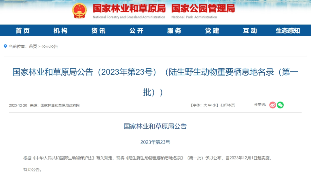 按照《野生动物保护法》对加强野生动物重要栖息地保护的要求,国家林草局组织专家收集了二十多年来我国各项野生动物资源调查所掌握的信息、数据,分类梳理了我国野生动物自然分布的特点、种群活动规律和生物学习性,制定了《陆生野生动物重要栖息地认定暂行办法》,对陆生野生动物重要栖息地的认定标准、评估程序、档案信息、范围划定、命名规则等作出技术性规范。经逐一分析评估,筛选出第一批陆生野生动物重要栖息地名录。下一步,将进一步加强对生境条件持续改善、但未列入名录区域的调查监测评估,将达到相关条件的,陆续列入名录。