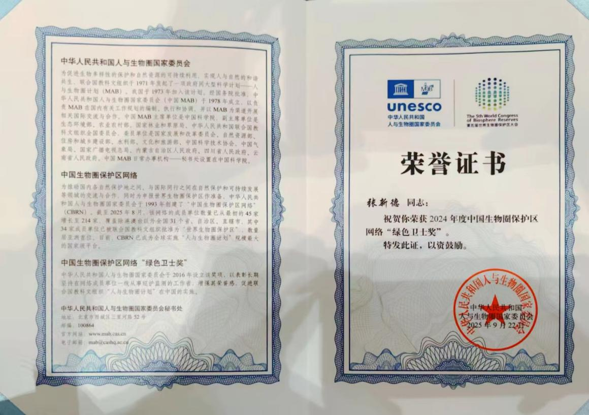 据悉,为了鼓励214家中国生物圈保护区网络成员单位青年科研人员积极开展科研工作,提高中国生物圈保护区网络成员单位的科研能力,以及表彰长期坚持在保护区一线从事巡护监测的工作人员,中国人与生物圈国家委员会自2016年起设立“青年科学奖”与“绿色卫士奖”,“青年科学奖”每年评选不超过3人,“绿色卫士奖”每年评选不超过5人。目前,中国生物圈保护区网络“青年科学奖”和“绿色卫士奖”已成为我国自然保护领域具有重要影响力的奖项。