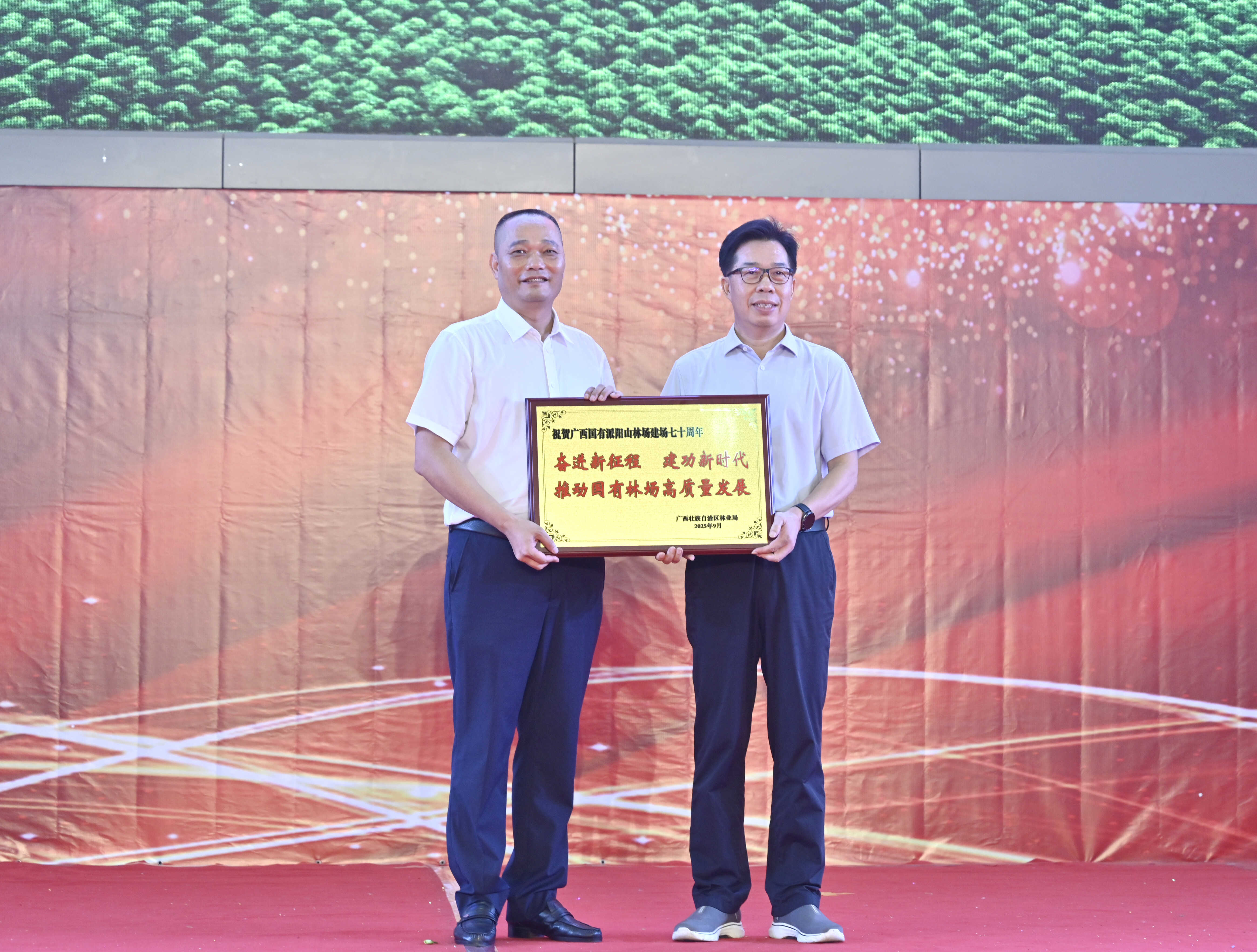 2025年9月29日,派阳山林场举办庆祝建场70周年活动。自治区林业局二级巡视员蒋桂雄代表自治区林业局向派阳山林场赠送贺匾并讲话。