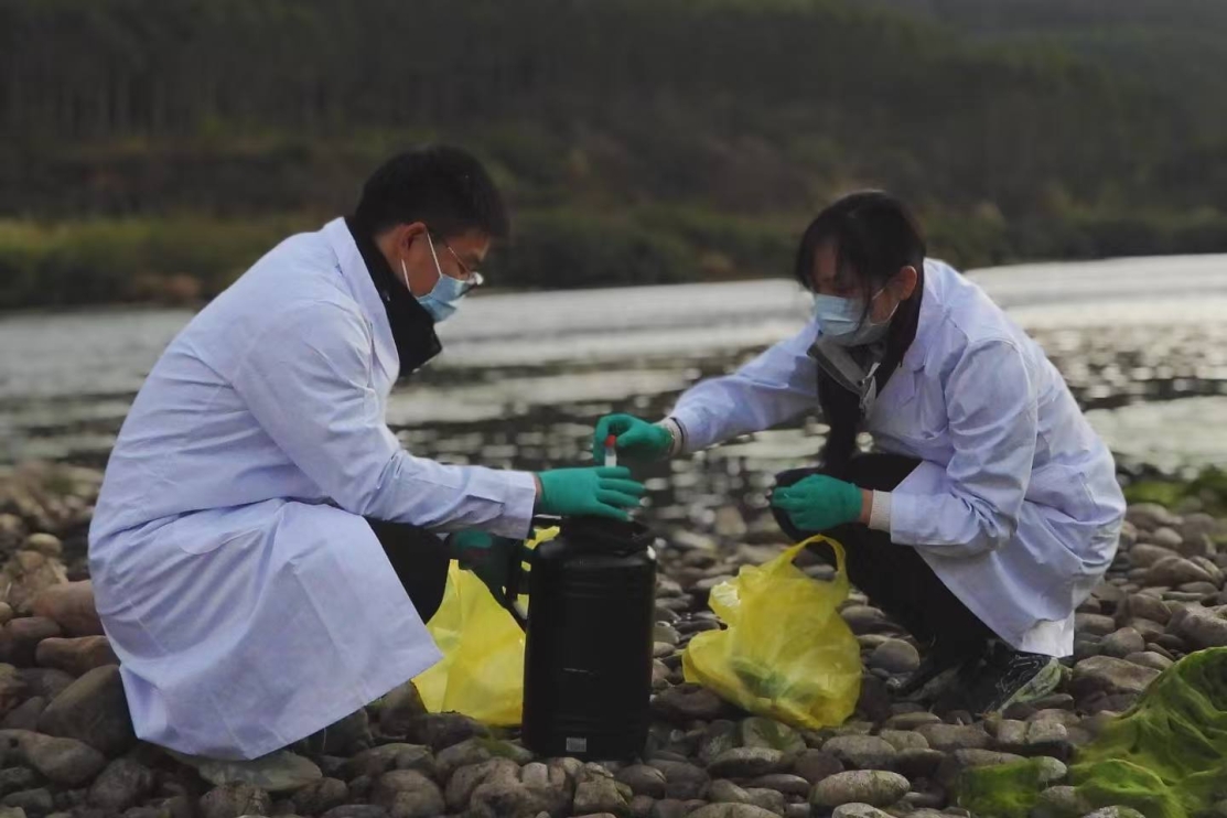 监测人员在东方白鹳活动后进行采样