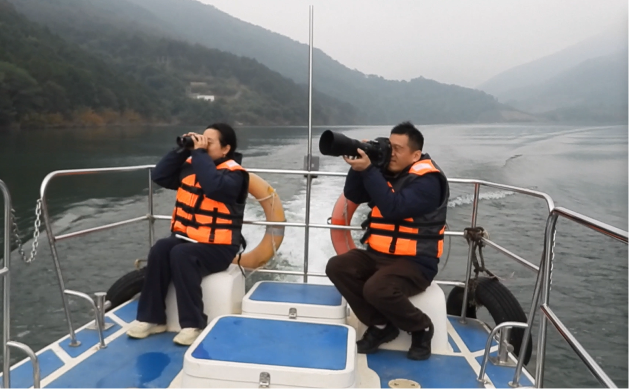 监测人员坐船在水面远远跟踪监测