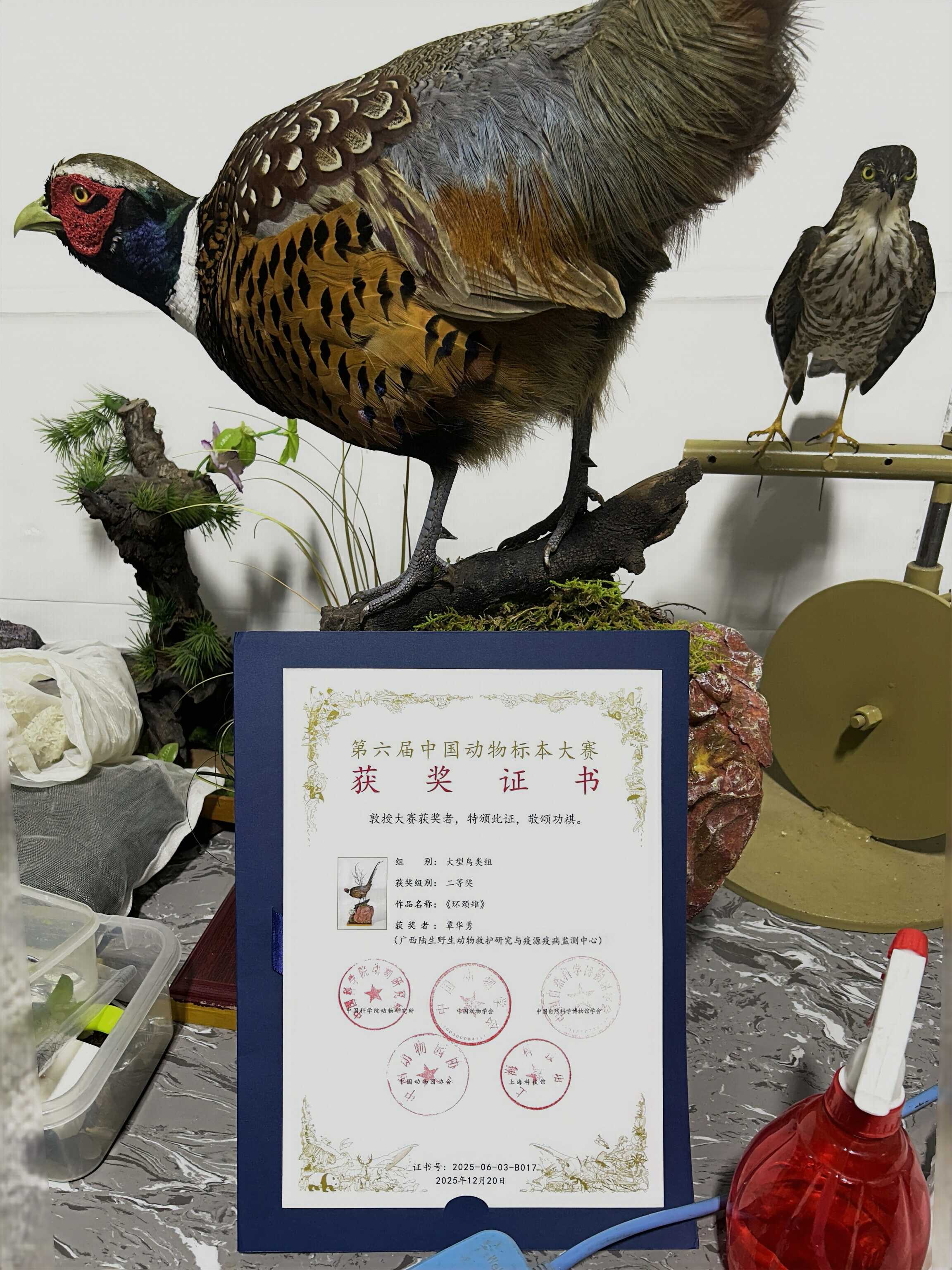 获奖作品——《环颈雉》及证书