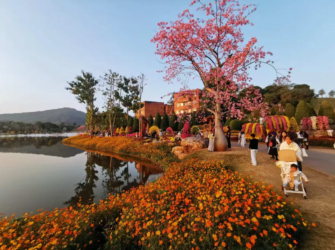 南宁市青秀山风景区内,缤纷绚烂的菊花与美丽异木棉竞相绽放,织就一幅流光溢彩的花海画卷。游人们穿梭其间,或驻足细赏,或拍照留念,在花影中感受绿城南宁独特的绿意。