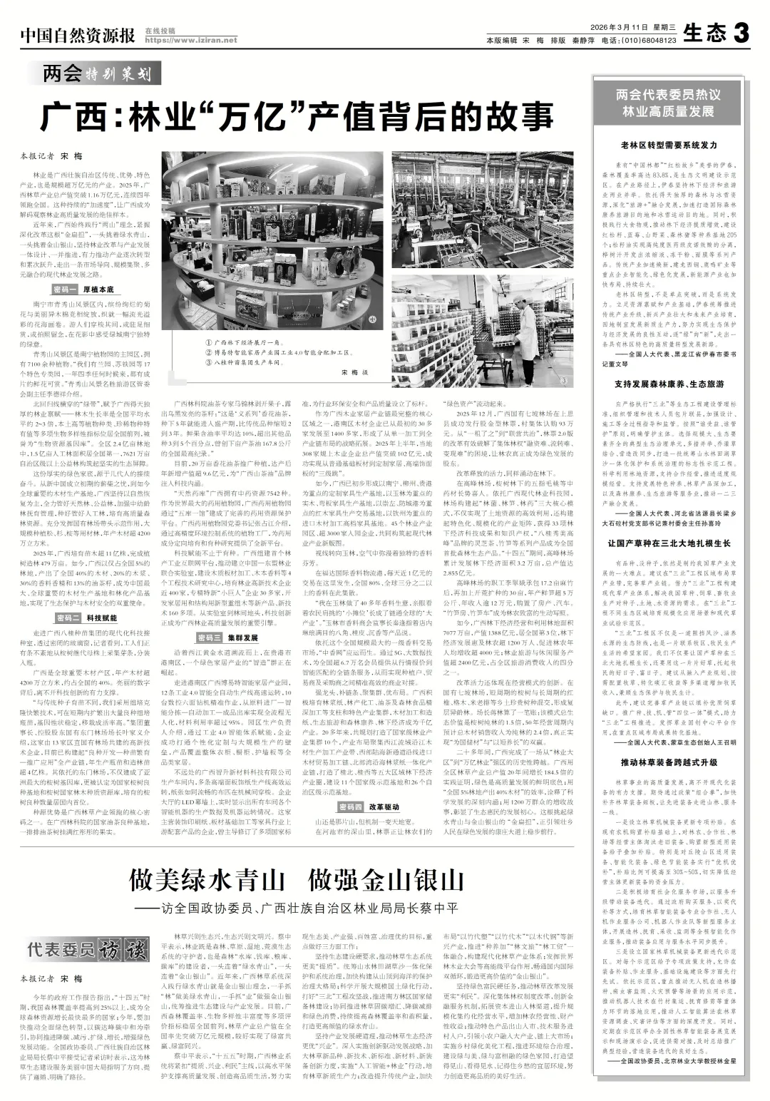 二十多年间,广西完成了一场从“林业大区”到“万亿林业”强区的历史性跨越。广西用全区林草产业总产值20年间增长184.5倍的实践证明,绿色是高质量发展的鲜明底色;用“全国5%林地产出40%木材”的效率,诠释了科学发展的深刻内涵;用1200万群众的增收故事,彰显了生态惠民的发展初心。这根挑起绿水青山与金山银山的“金扁担”,正引领壮乡人民在绿色发展的康庄大道上稳步前行。