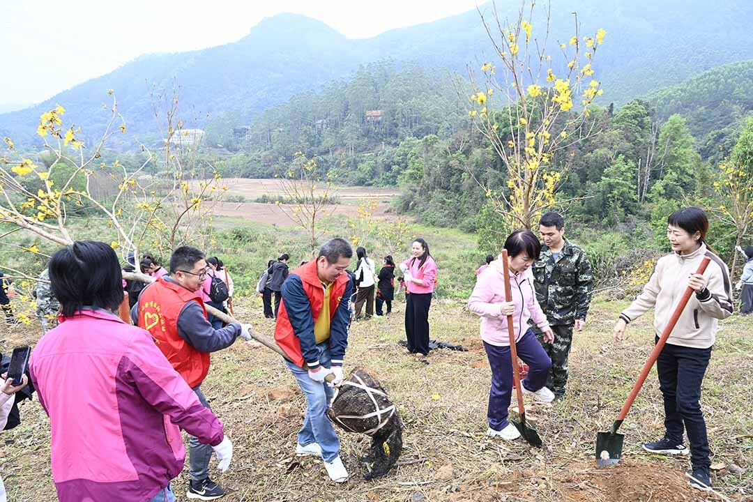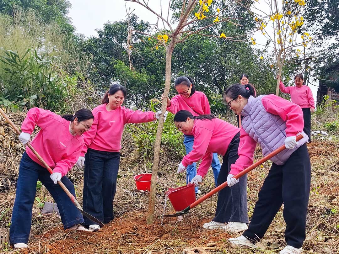 活动现场,参加人员三两成组、分工协作,一派热火朝天的劳动景象。有的挥锹铲土、开挖树坑,有的扶苗定位、调整角度,有的培土踩实、提桶浇水,每一道工序都做得认真细致、有条不紊。经过一上午的辛勤劳动,270株新栽的黄花风铃木迎风挺立,在初春的阳光下展现出勃勃生机。