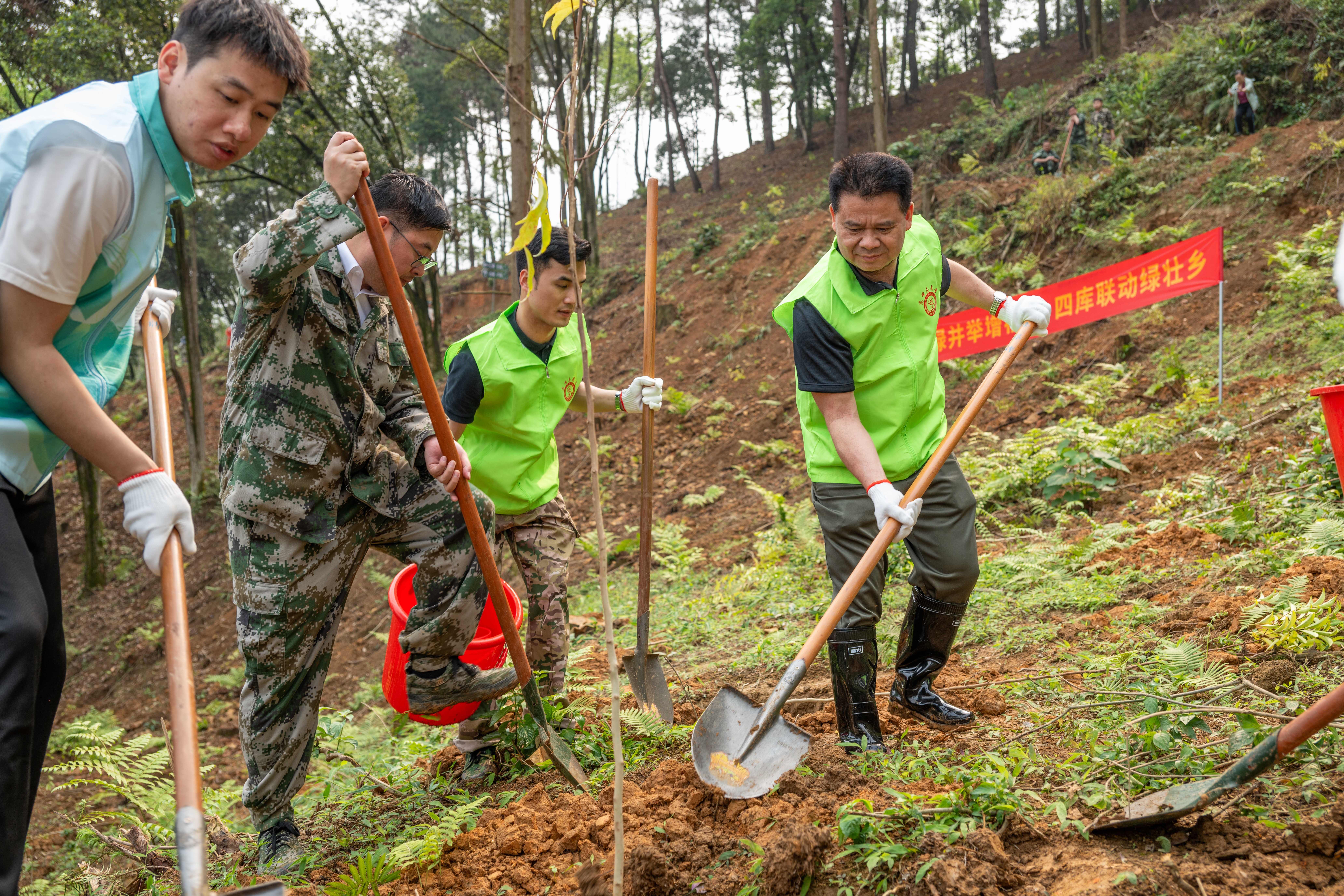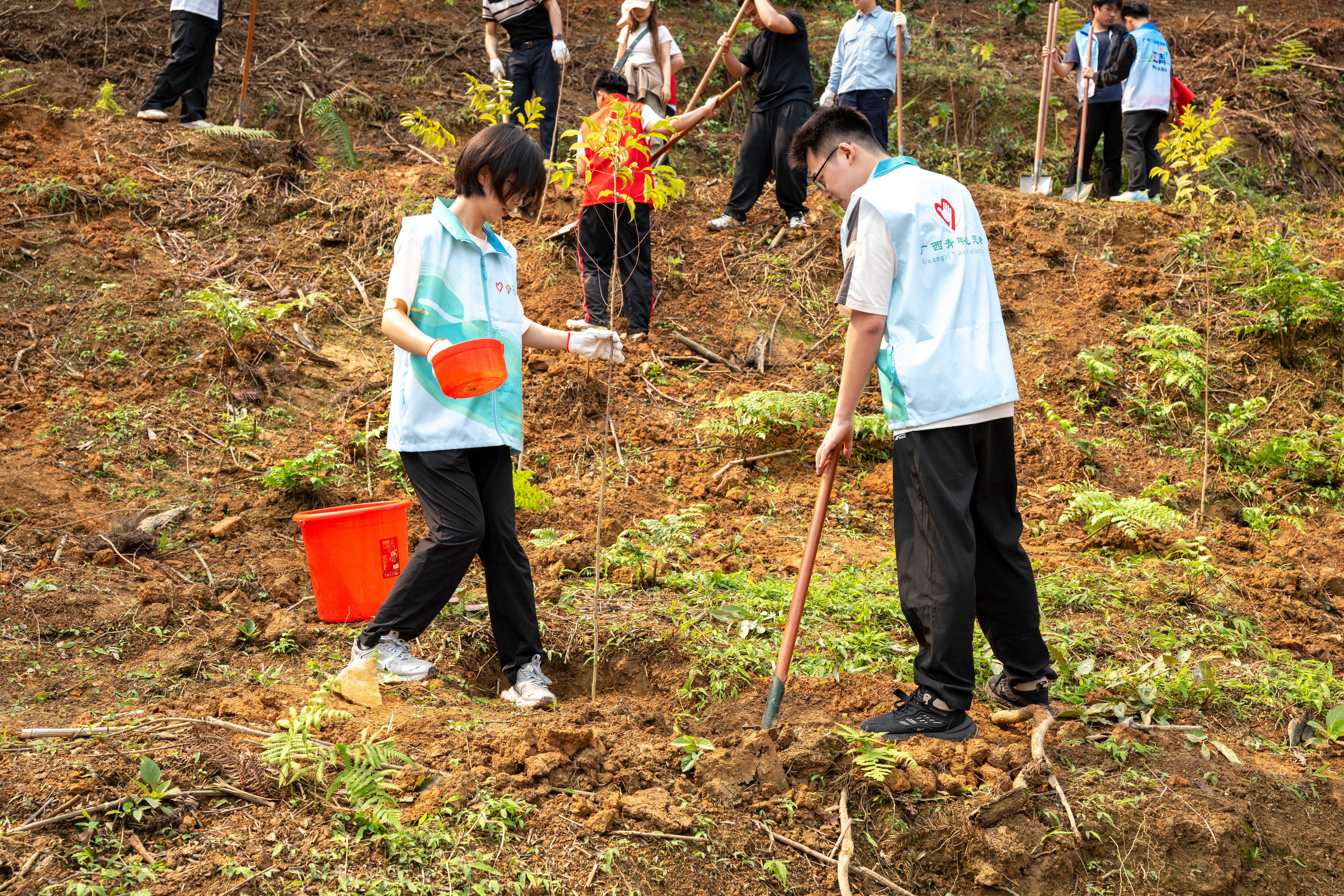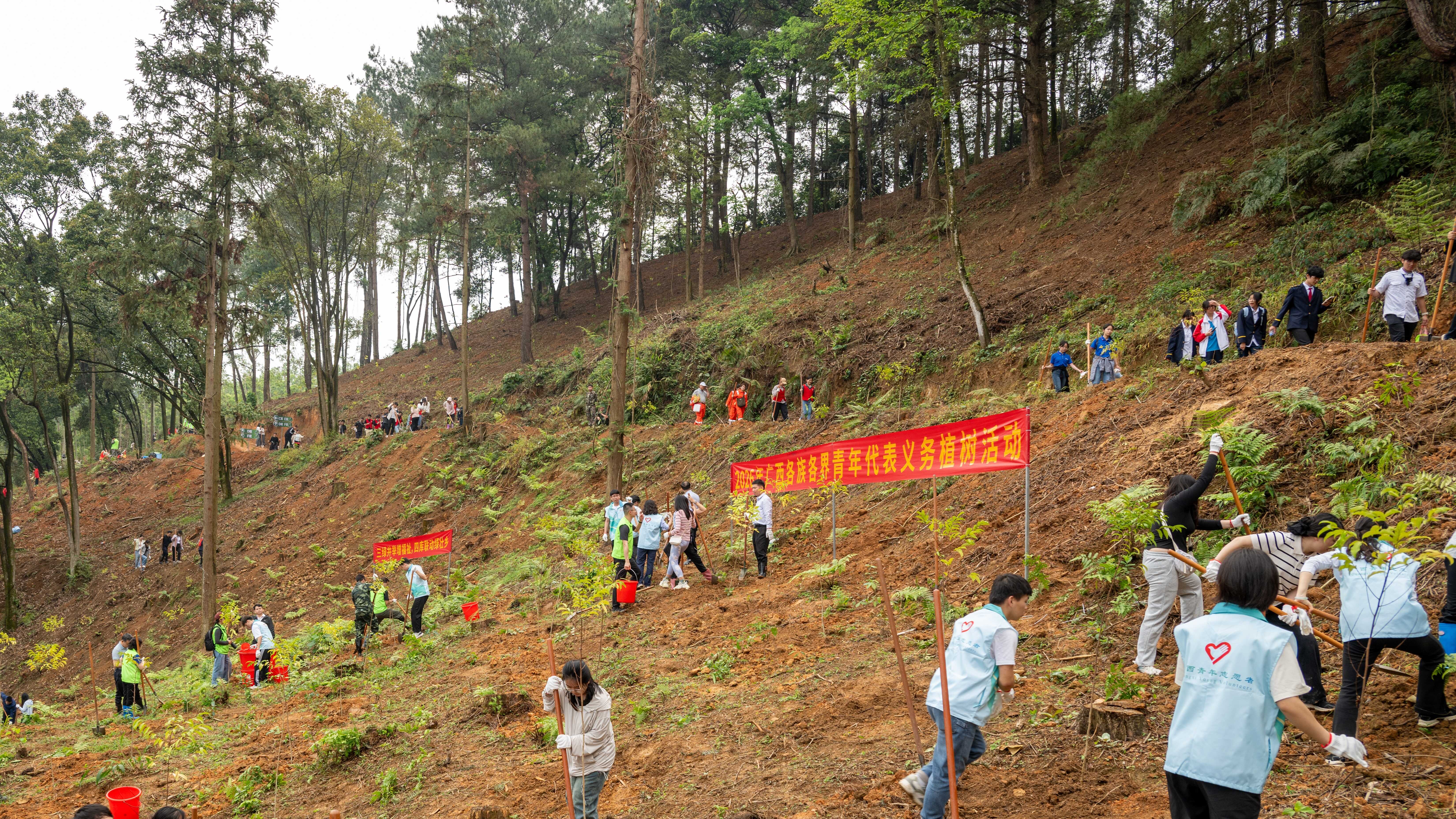自治区林业局选派林业技术人员现场指导,提供全流程技术支持。参与人员分工协作,规范完成扶树正苗、培土围堰、提水浇灌等操作,共种植红花天料木、江南油杉等树苗2000株,为“广西青年林”新增一片绿意。