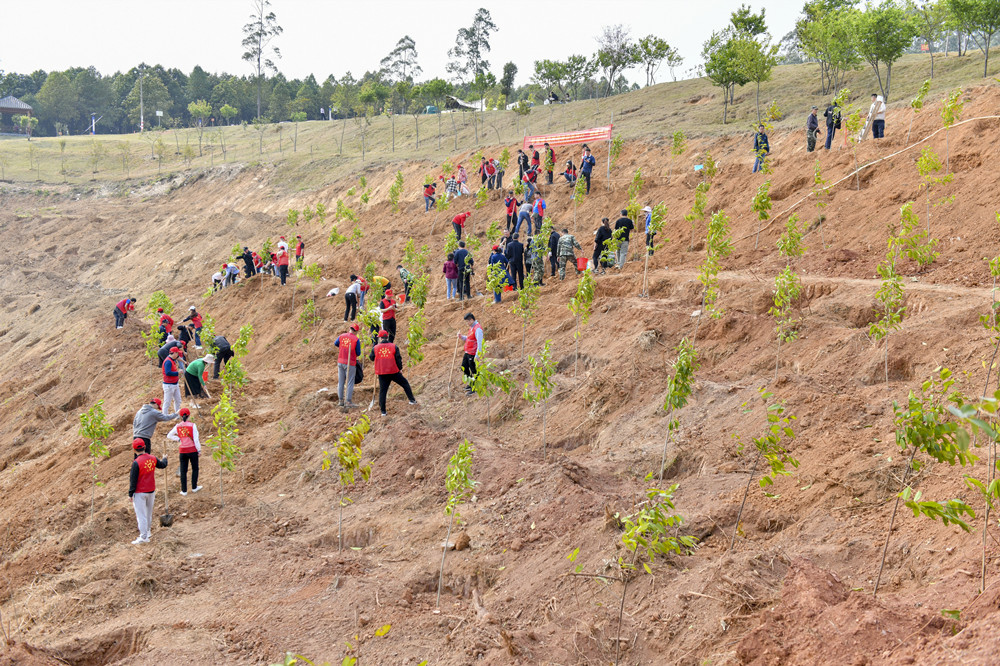 植树现场,自治区公共资源交易中心党组书记、主任蒋名斌与大家一起分工协作,铲土、栽植、回填、浇水,共种植近百株香梓楠。
