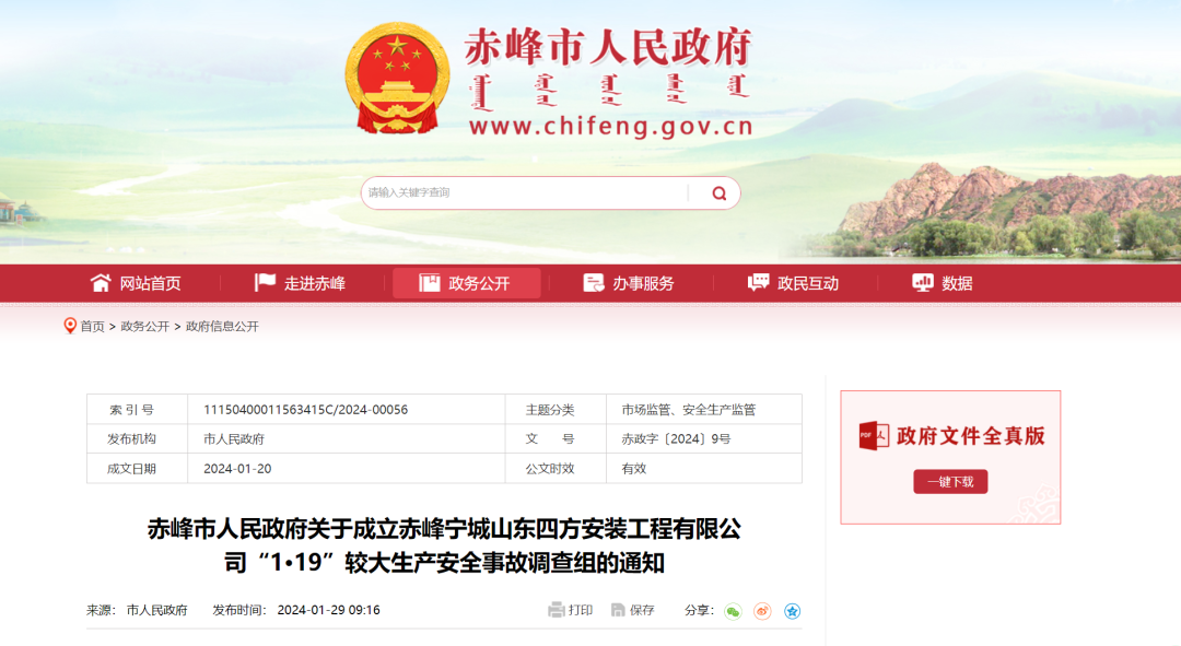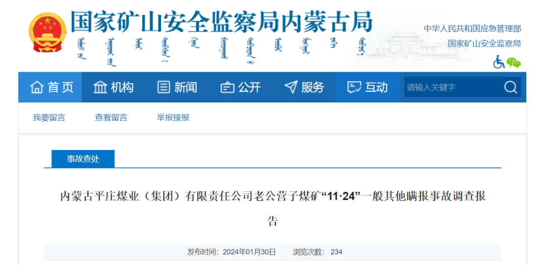 内蒙古赤峰市人民政府发布《赤峰市人民政府关于成立赤峰宁城山东四方安装工程有限公司“1•19”较大生产安全事故调查组的通知》1月29日,内蒙古赤峰市人民政府网站发布《赤峰市人民政府关于成立赤峰宁城山东四方安装工程有限公司“1•19”较大生产安全事故调查组的通知》。通知显示,2024年1月19日,山东四方安装工程有限公司在赤峰市得丰焦化有限责任公司化产车间4#电捕焦油器加装氮气管道时发生闪爆造成3人死亡。依据《生产安全事故报告和调查处理条例》有关规定,市政府决定成立赤峰宁城山东四方安装工程有限公司“1·19”较大生产安全事故调查组开展事故调查工作。《内蒙古平庄煤业(集团)有限责任公司老公营子煤矿“11·24”一般其他瞒报事故调查报告》公布1月30日,国家矿山安全监察局内蒙古局公布《内蒙古平庄煤业(集团)有限责任公司老公营子煤矿“11·24”一般其他瞒报事故调查报告》。2021年11月24日14时20分,内蒙古平庄煤业(集团)有限责任公司老公营子煤矿4#转运站至储煤筛分破碎车间栈桥第七段桁架处地面工业广场发生一起一般其他事故,造成2人死亡,2人受伤,直接经济损失425万元。事故发生后,事故责任单位未向当地政府及有关部门报告事故情况,刻意隐瞒事故真相,后经群众举报、有关部门核查,查实了其瞒报事故行为。事故直接原因为鲁京公司班长王建东在桁架第一组单片已固定的情况下,使用手拉葫芦拉动单片,造成单片整体倾倒,导致王建东、陈显明当场死亡,任红卫、陈林栋受伤。