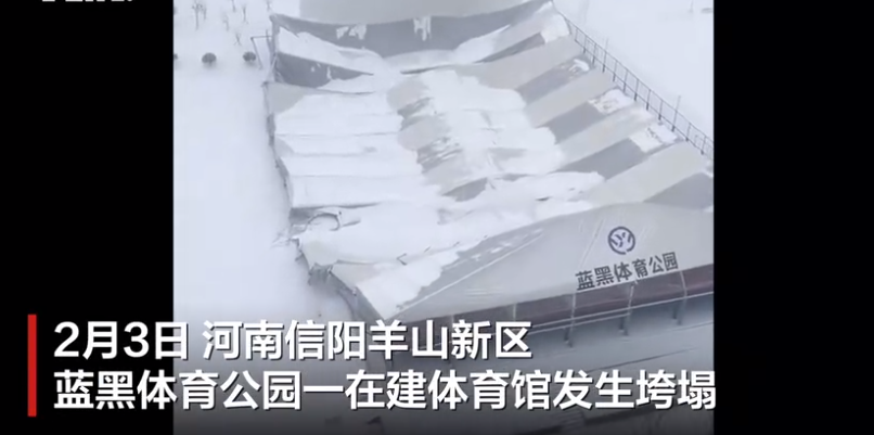 2月3日,河南省信阳市羊山新区一体育馆坍塌。据悉,事发地为信阳蓝黑体育公园,时间为3日10时许。坍塌的场馆处于停工状态,一直未投入使用,无人员伤亡。
